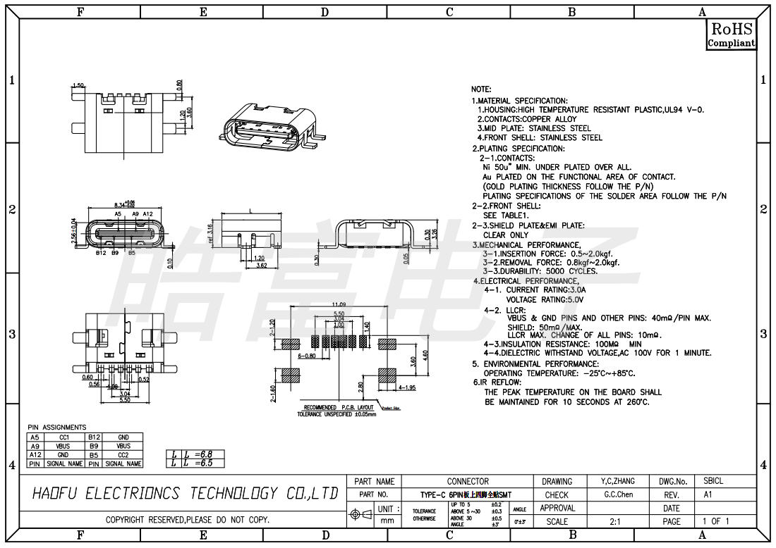 USB连接器TYPE-C 6PIN板上四脚全贴SMT