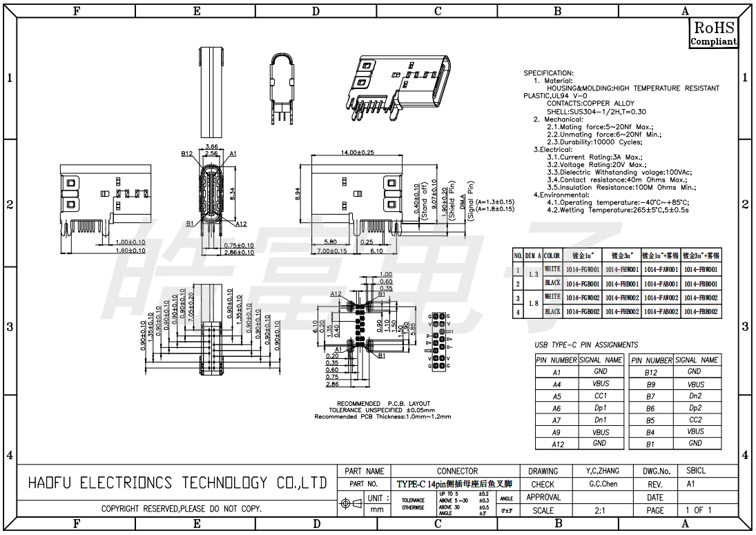 USB连接器TYPE-C 14PIN侧插母座后鱼叉脚