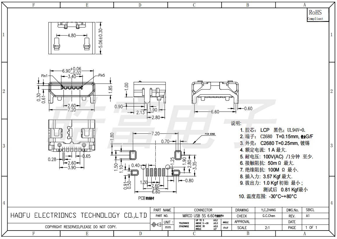 0099-MIRCO USB连接器 5S 6.60牛角有柱平口