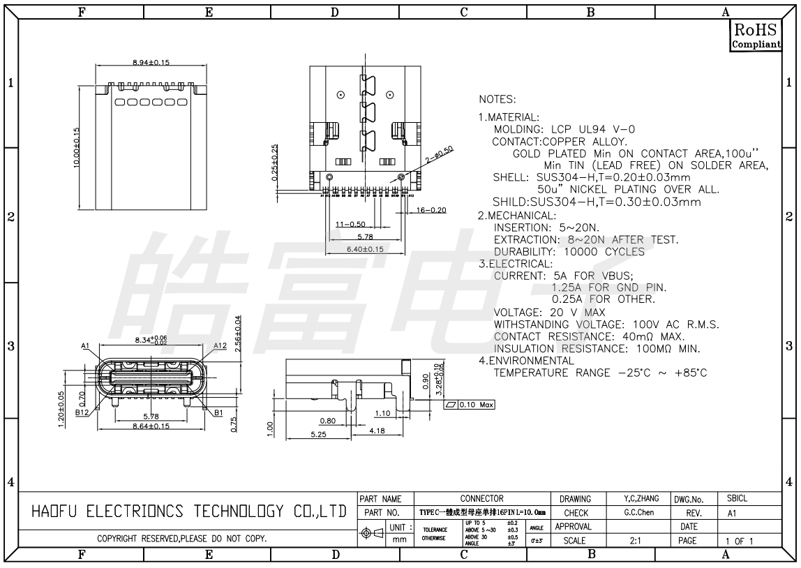 TYPE C一体成型母座单排16PIN L=10.0mm 1