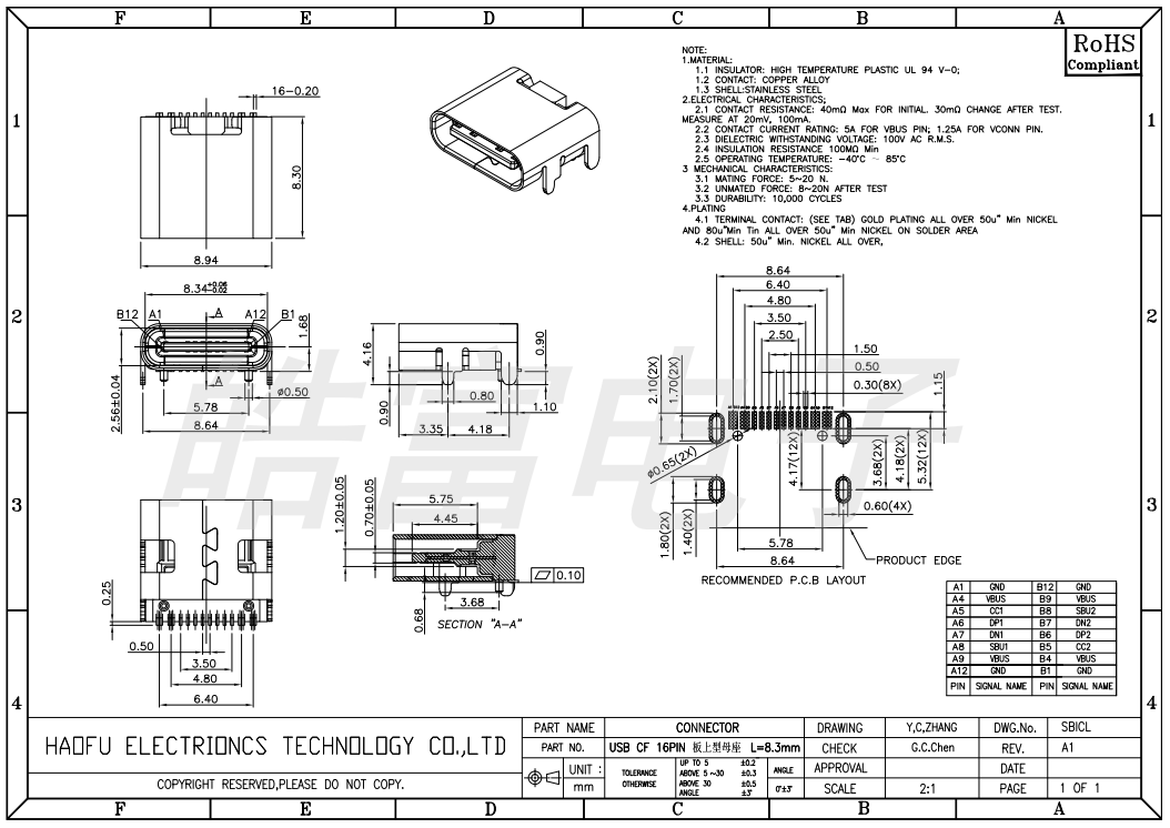 JDR-USCF049-S008 USB TYPE C 16P板上8.30 1