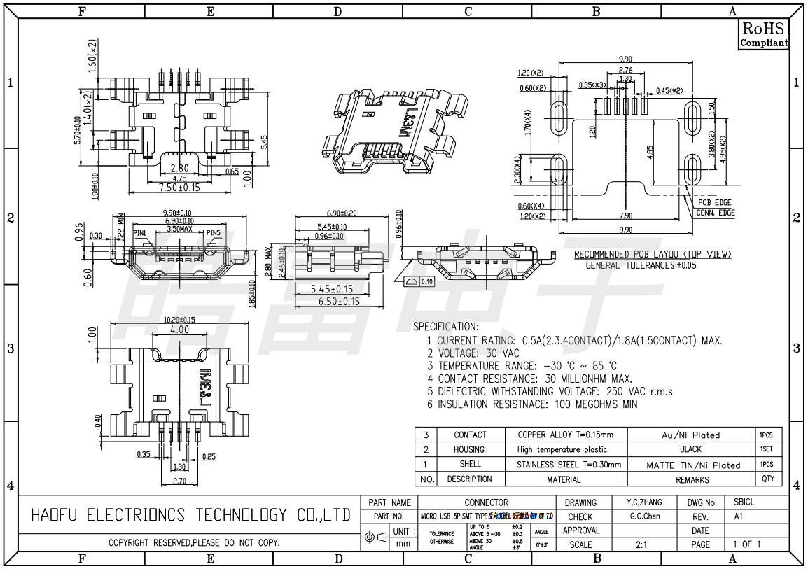MICRO USB 5P SMT TYPE反向沉板1.0无翻边(HW CW-7X) 1