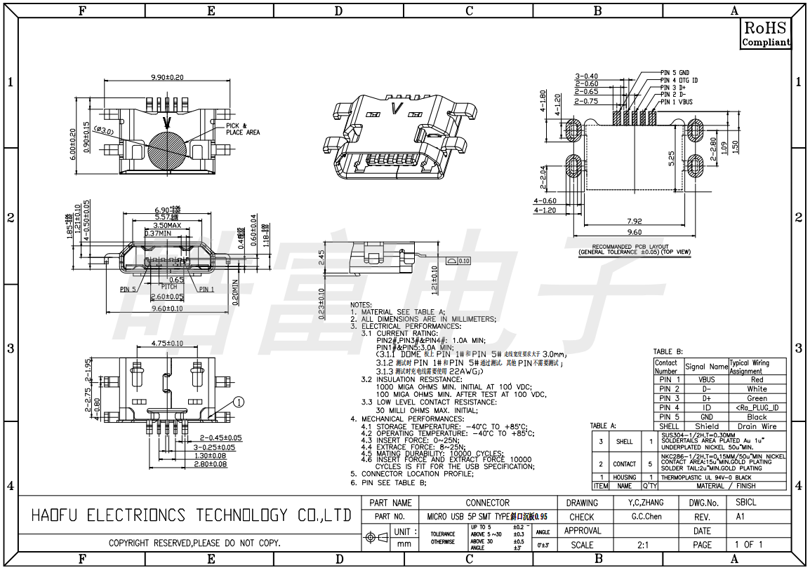 MICRO USB 5P SMT TYPE斜口沉板0.95 1
